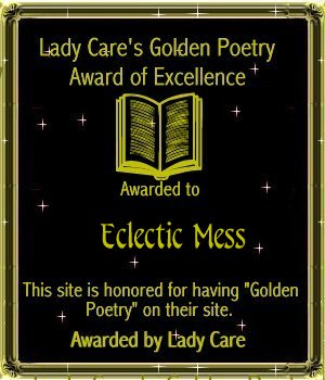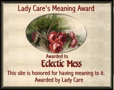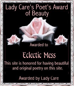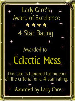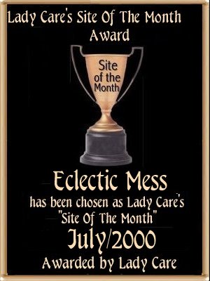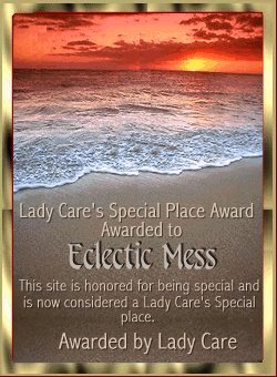 The following awards were all given to me by Lady Care, a very kind woman whose site I stumbled upon at random some time ago. Not only has she given us all these beautiful awards, she's also re-designed the many pages that make up Eclectic Mess to make them more viewer-friendly! While this version - designed by myself - works well only with newer browsers, the pages she'd designed are perfect for even the oldest. To take a look at them, please click here. To visit Lady Care's wonderful pages, click on any of the awards below!