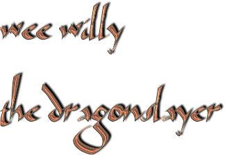 | "Maybe he Wee Willy be but, nonetheless, tis said, "This mightly little ailfen boy hunts for the Dragon's head!!" Wee Willy has upon his feet the skin with which he twas born, upon his head he wears a hat, his dark brown locks are shorn. His stance be least two pixies high, but, "Never", there be said, "a greater knight in all faeland than Wee Willy; so don't be misled." Wee Willy, come, O let us go into the canyons deep, for there to find the mighty beast; with luck.... he be asleep! Wee Willy grabs his sword in hand, the hand with steely glove, and, forth he goes to find the one of which Legends speak of. So now, in canyon shrouded mist Wee Willy, fearless, treads. For here to find his destiny in smokey dragon beds. And as Wee Willy descends the cave of the mighty Dragon Beast, his heart begins to shed its armor for what his eyes did feast. As Wee Willy looked about the cave amidst the smoke and gloom a wondrous sight for all to see, of a baby dragon in bloom. This wee small thing with pointed ears and a spiny pointed tail did look upon our mighty Wee Willy and quickly began to wail. As Wee Willy went to comfort him, he at once did comprehend, no Dragonslayer twas he, at all, he'd just became the Dragons' FRIEND. Written By Bexboomer 7/27/98 �All Rights Reserved |