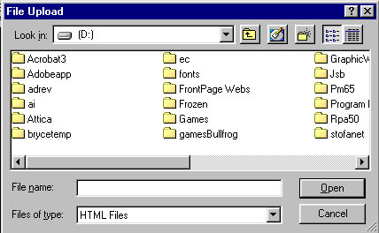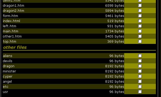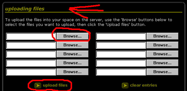 of how one uploads with the advanced file manager. go to http://fortunecity.com and look for the thing I have framed in red in the image below. click on it. ![]() That should lead you to a new page, and on that page, on the left side there ought to be something like that which I have framed in red... click on it. ![]() Then you get prompted to enter your username or password, if you haven't already used it on the boards. If you get prompted, enter the information. ![]() Then you should be in the advanced file manager.... The image below shows how the top of my account look like in the advanced file manager. ![]() If you scroll down, you will find a list of the files that you already have in your account. Just scroll down past that list.... ![]() As you scroll down, you ought to find something that looks like the image below, where it says uploading files. click on one of the browse buttons (framed in red...) ![]() a box pops up, where you can choose which file you want to upload. Do this with the other browse buttons as well, if you have ten files or more..... otherwise just do it until you have selected all the files you want to upload. ![]() then, tadaaaah, click the upload files button that are located beneath the browse buttons. Now the file manager starts uploading you pages, and as the page reloads, your files will be in the directory listing..... ![]() You now know how to upload files with the file manager. |