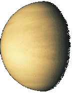 Venus, the jewel of the sky, was once know by ancient astronomers as the morning star and evening star. Early astronomers once thought Venus to be two separate bodies. Venus, which is named after the Roman goddess of love and beauty, is veiled by thick swirling cloud cover. Astronomers refer to Venus as Earth's sister planet. Both are similar in size, mass, density and volume. Both formed about the same time and condensed out of the same nebula. Venus is very different from the Earth. It has no oceans and is surrounded by a heavy atmosphere composed mainly of carbon dioxide with virtually no water vapor. Its clouds are composed of sulfuric acid droplets. At the surface, the atmospheric pressure is 92 times that of the Earth's at sea-level. Venus orbits the Sun at a mean distance of 108,200,000 km and is scorched with a surface temperature of about 482° C (900° F). This high temperature is primarily due to a runaway greenhouse effect caused by the heavy atmosphere of carbon dioxide. A Venusian day is 243 Earth days and is longer than its year of 225 days. Oddly, Venus rotates from east to west. To an observer on Venus, the Sun would rise in the west and set in the east. |