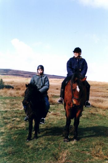 Hobby and Roxanne being ridden by Harriet and Mum, respectively, over the moors. you can just see Beamsly Beacon in the background. |