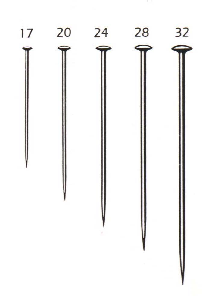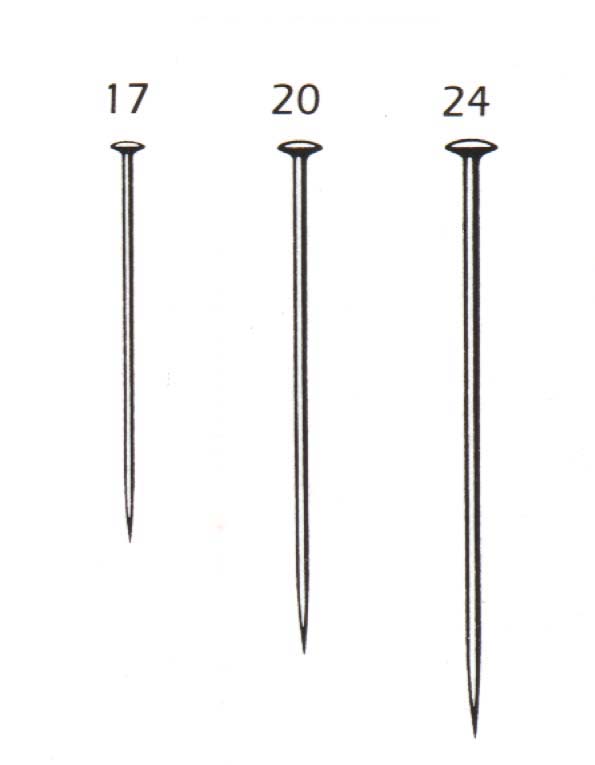 | Satin pins, those with the 's' suffix, are a fine gauge steel straight pin and dressmaker pins are medium gauge. Both are packed in 1/2 lb. boxes. | |||||