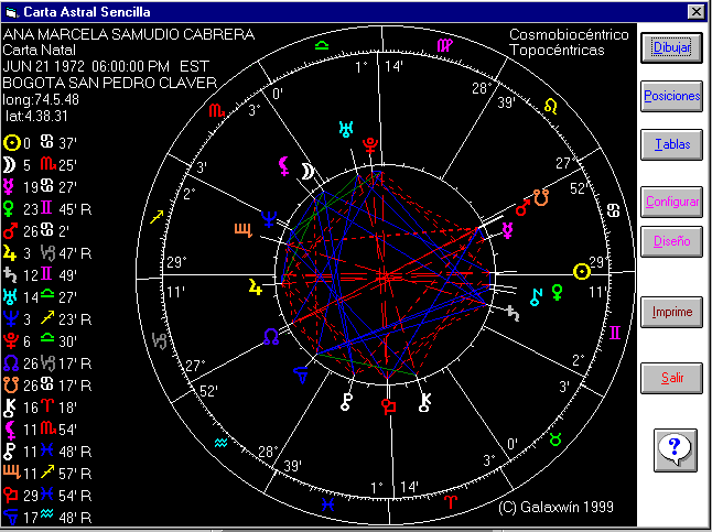 Ejemplo de una carta natal, tal como se ve en la pantalla del computador usando el estilo con fondo negro.