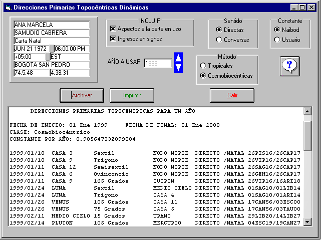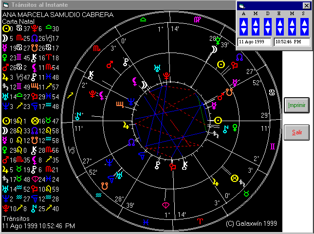 Se pueden ver los tránsitos al instante sobre una persona y moverse en el tiempo, años, meses, días o horas con solo hacer clic, mientras se ve su posición y los aspectos que hace a la carta en uso.