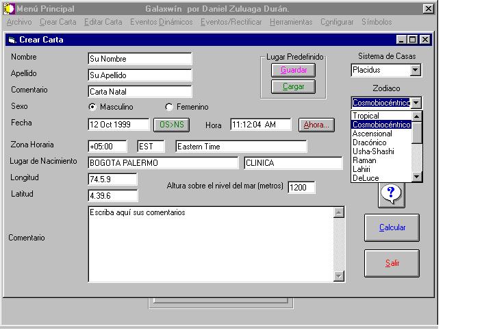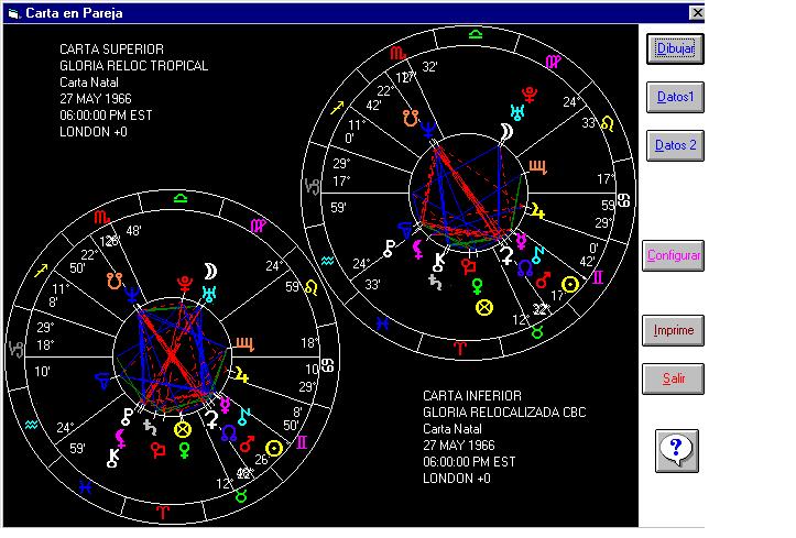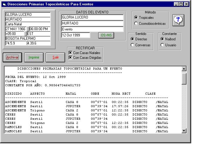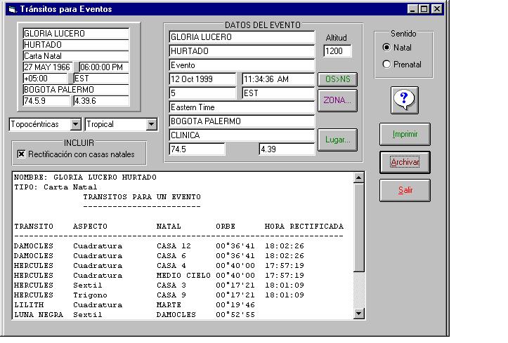 Se pueden ver los tránsitos natales para un evento, y el programa Galaxwín automáticamente calcula la hora rectificada para cada tránsito.