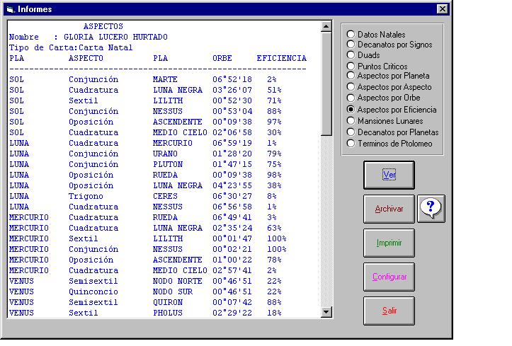 En esta ventada, se ven los aspectos de la carta. A la derecha se pueden ver los diferentes informes que se pueden obtener.