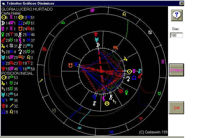 Se ven los tránsitos gráficos del sol, y los planetas mayores durante 6 meses. Se pueden seleccionar tránsitos para cualquier planeta o asteriode y por cualquier período de tiempo.
