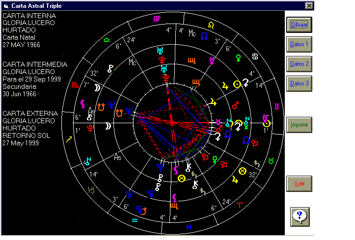 Se puede ver una carta triple en la que se han dibujado la carta natal, las progresiones secundarias y la revolusión solar.