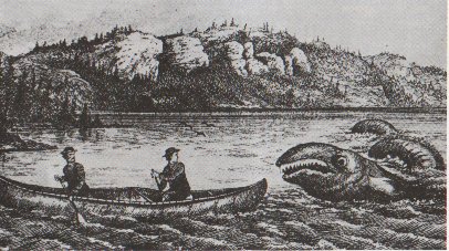 Here's an old drawing of the cryptid of Lake Utopia surprising a couple of boaters. For some reason, the expression of the guy in the back cracks me up. He's like, "Oh, gee, a monster. You don't see that every day. How odd." :-)