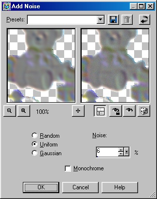 Step 7: Go to Effects/Texture Effects/Emboss. Step 8: Go to Adjust-Add/Remove Noise-Add Noise as shown in Screen Shot 6: