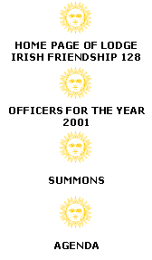 To read the dispensation to convene the meeting. To open the Lodge. To read the summons convening the meeting. To read, put for confirmation and sign the minutes of 380th regular meeting held on 2nd Feburary 2001. To receive & move for adoption the minutes of the PC held on 2nd February 2001 and vote on the recommendations, if any contained therein. To receive the Stewardship report of the W. Master of the year 2000. To ballot for the joining of Bro. B.K. Sehgal, Master Mason of Lodge Justicia, cleared by PC held on 2nd February 2001, proposed by Bro. Vinod Sehgal and seconded W. Bro. Rajiv Khanna. To ballot for the following and if the ballot proves clear to initiate them: