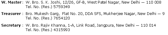a) Mr. Anil Chak DOB 9.11.53, Advertising Executive, r/o G-302, Prince Aptt., IP Ext., Patpargunj, Delhi. b) Mr. Prem S Khamesra, Chartered Accountant, New Delhi. 9. To open the lodge in Second degree and to pass any two of the following to the degree of FCFM if found proficient in first degree: a) Bro. Bhagirath Gupta; initiated on 4.12.98 b) Bro. PGB Nair; initiated on 1.10.99 c) Bro. Shailendra Bajaj; initiated on 4.2.2000 d) Bro. S.K. Mehra; initiated on 7.4.2000 10. To open the lodge in third degree and to raise Bro. Roshan Lal Bajaj passed on 3.11.2000 if found proficient in the second degree. 11. To receive the Rt. W. the Regional Grand Master, Rt. W. Bro R.S. Dewan, along with his delegation to inaugurate the official website of our lodge. 12. Close the lodge in third and second degrees. 13. To pass the audited accounts of the lodge for the year 2000. 14. To offer Birthdays greetings to brothers born in the month of March.