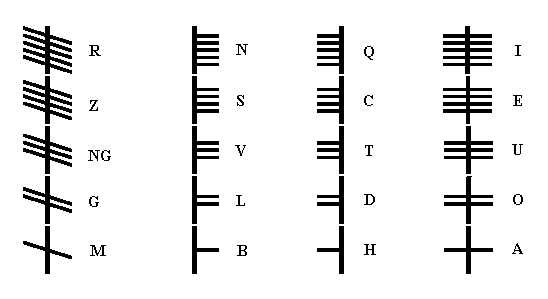 The Ogham is a tree alphabet which predates Celtic tribes. They are found on Pictish stones. The Picts originated from Scotland and were assimilated by the Celtic tribes eventually. The Ogham Alphabet highly resembles some instriptions that were located in N. Italy in the last few centuryies B.C