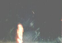 | The original Polaroid photo contained scratches, which appear as diagonal lines in this image. Note, however, the orange-tan object, above and just to the right of the creature. There is also an orange object at the extreme right. High resolution scans of these objects were inconclusive. What they