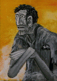 There is a dirty old bum on a crutch. I try to avoid eye contact but he is moving in, `he is going to ask me for money or something�.
