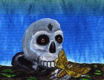 Durand waited a moment, then with a sudden upward movement he stripped off the mask and threw back the man's head. We were looking into the eye sockets of a skull. Durand stood rigid; the mayor shrieked. The skeleton bust out from its rotting robes and collapsed on the ground before us. From between the staring ribs and the ginning teeth spurted a torrent of black blood, showering the shrinking grasses; then the thin shuddered, and fell over into the black ooze of the bog. Little bubbles of iridescent air appeared from the mud; the bones were slowly engulfed, and, as the last fragments sank out of sight, up from the depths and along the bank crept a creature, shiny, shivering, quivering its wings.
