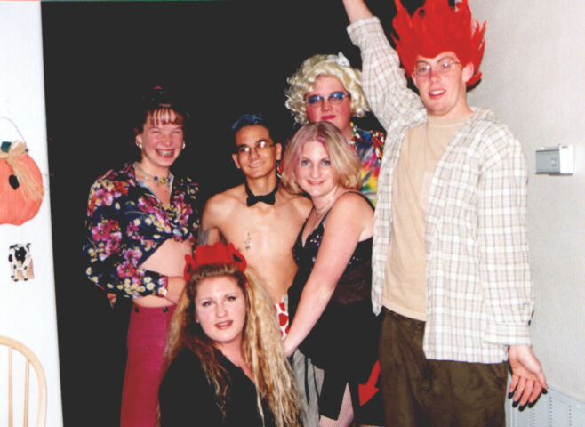 From left to right: Blythe (Mat's sister and a "hippy girl"), Me, Aaron (stripper), Krissy (whore...seriously, that was her costume!), Ben (Mimi from The Drew Carrey Show), and Mat (the devil...what else?)