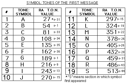 Note: Message Two introduces 18 new tones for a total of 37 (see TON).