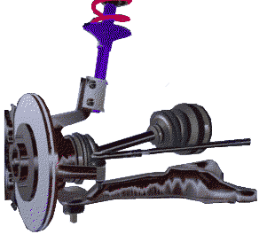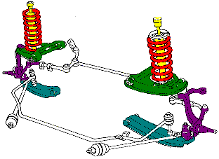type of double-A arm suspension. The wheel spindles (purple) are