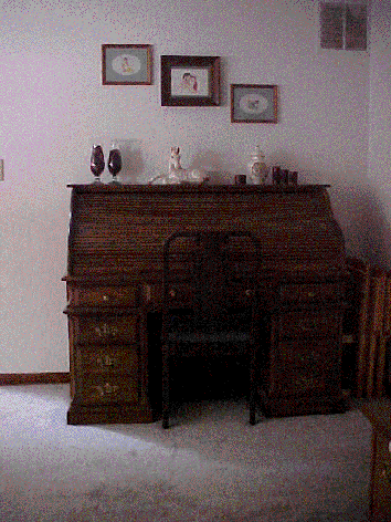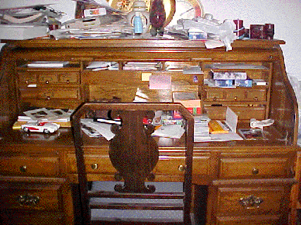 This desk is also in my living room. I really do need to work on remove all the junk from the top of it. Until recently the inside had been so full of junk (mail dating back to 1997) that we started just piling things on top. I need to get back to getting it ALL in order.