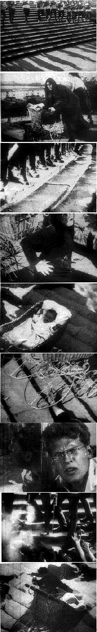 One of the landmarks of Soviet silent cinema -- and of film in general. Sergei Eisenstein's innovative editing techniques in this masterpiece have influenced directors from mainstream Hollywood to the avant-garde. The film recreates and celebrates an uprising that occurred in Odessa in 1905, during the first stages of the Russian Revolution. Sailors, enraged at their poor treatment -- one of the most memorable sequences shows the maggot-ridden meat meant for their dinner -- mutiny and sail to Odessa. The revolutionary fervor spreads, and Cossacks loyal to the Czar violently attempt to squelch the explosion. But the people will win out... Special scene: the Odessa Steps sequence, a masterfully edited, emotionally powerful episode. For those who have seen de Palma's "The Untouchables", this is the direct inspiration for the scene in Grand Central Station. Montage in by Attaway at http://www.slip.net/~attaway/ Definition: "In film language 'montage' means the uniting of shots of seemingly unrelated objects in the same film sequence so that they take on a new relationship to each other in the mind of the viewer."1 The classical example of montage technique is the film Potemkin by Eisenstein (1927) - however, we are surrounded by montage: nearly every MTV video is a montage, as are most TV commercials. Montage segments are typically short: Eisenstein used shots from 1/2 second to about 14 seconds in Potemkin - the majority of his shots were about 2 1/2 seconds long. Single Time Stream: In Potemkin, the famous sequence on the Odessa Steps shows the same event from multiple points of view as it occurs. There is only one time stream. Televised football and baseball games routinely use this "real time" montage technique - cutting rapidly from reaction shots of the crowd, to the pitcher's windup, to the batter, to the manager, back to the crowd. F.O.W. F.O.G. The summary above uses the adjective "innovative" to describe Eisenstein's techniques. Give an example of another artist or musician who is innovative, and explain why. The writer (Attaway above) uses the adjectives "seemingly unrelated" to describe what sort of objects are in a montage. What does he mean to say? F.O.E. Look over the eight images, and in a list briefly describe what image is "captured" by that view of the camera. F.O.I. Using the review on the top (and your dictionary), summarize in your own words what the Battleship Potemkin is about. |
