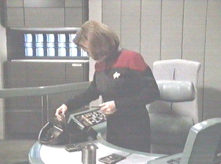 On the righthand side of the desk relative to the captain, there is