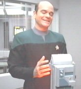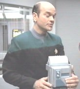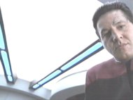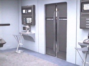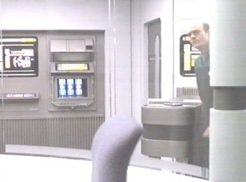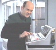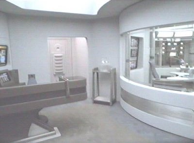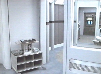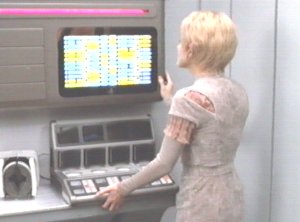 attends a control panel in sickbay. The red lightstrip indicates that the ship