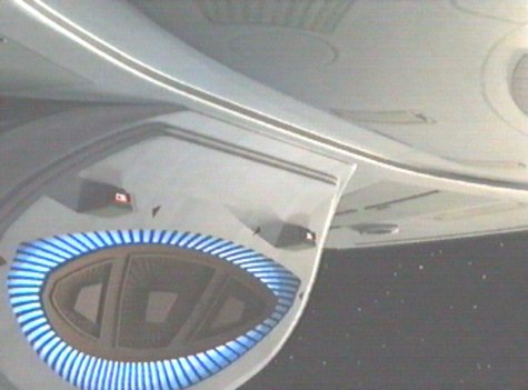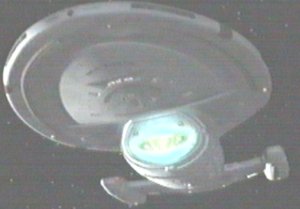 ![]() Close-up of the main deflector. The two small objects above it are the starboard and port front-facing torpedo launchers - see here or, for pictures only, here. [#149 Drive] |