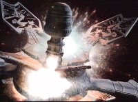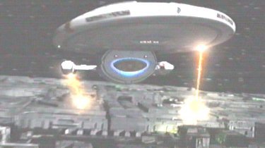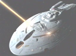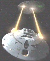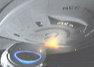 ![]() Bethel flies over a target and fires phasers (here the target is a Borg tactical cube). [#146 Unimatrix Zero, Part One] |