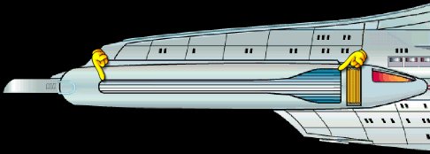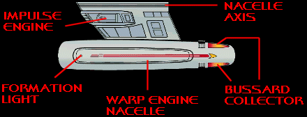 | A Bussard Collector is located at the front of each warp nacelle. Also known as a Bussard ramscoop, the Bussard Collector employs powerful electromagnets to attract interstellar hydrogen ions for use as fuel by the ship's fusion reactors. The concept was developed in the 1960s by real-life physicist Robert Bussard. | ![]() |