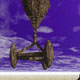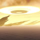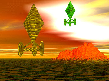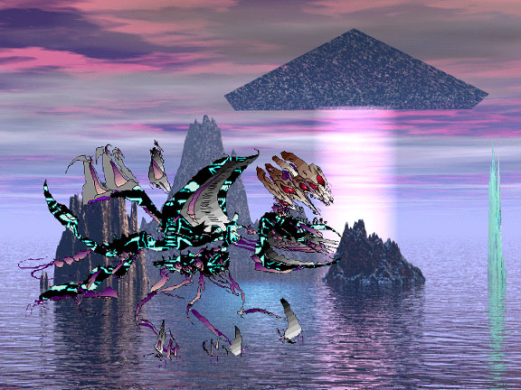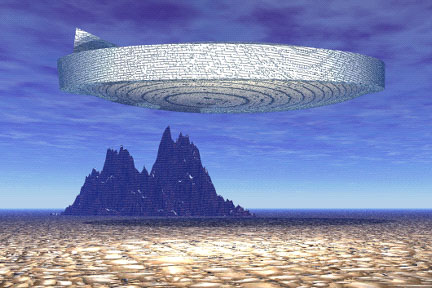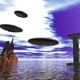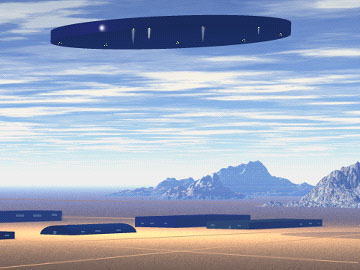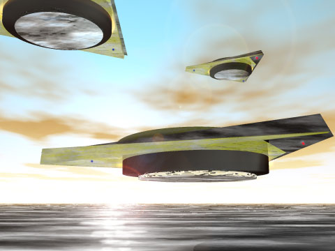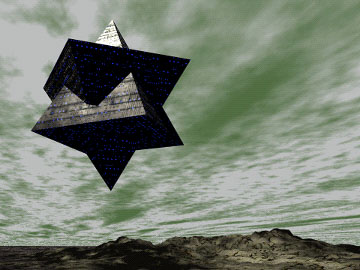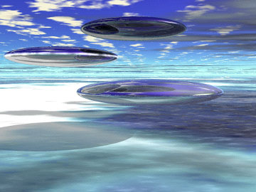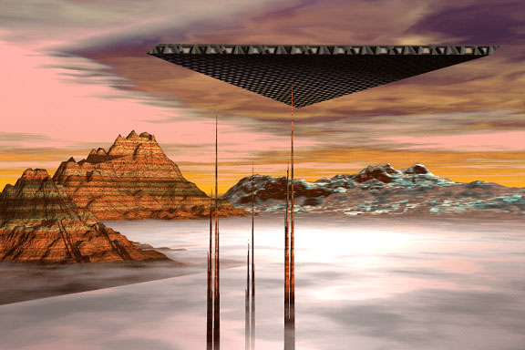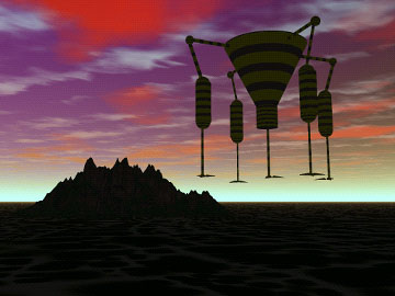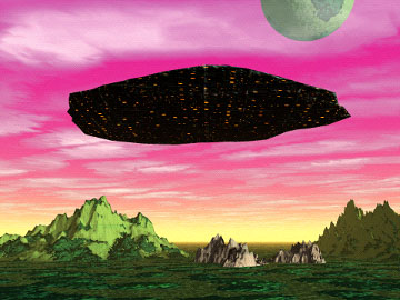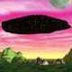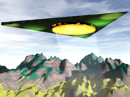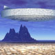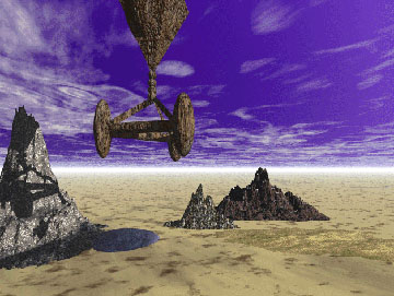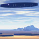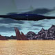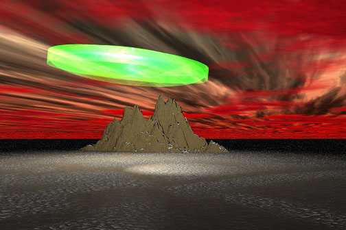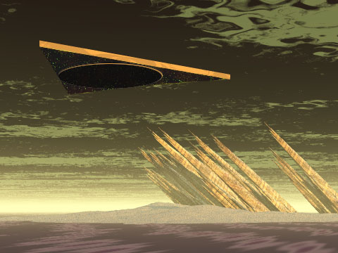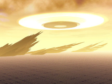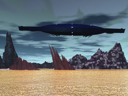 A diffuse, interdimensional craft over an alien landscape. |