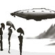 A Remote viewing image of a non-terrestrial planet and a mothership. |