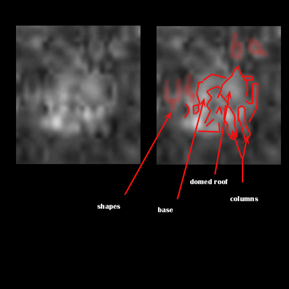This structure has the same basic components as the famous Taj Mahal. The Dome on the top and columns around the base. There are circular objects around this structure. Possibly smaller statues.