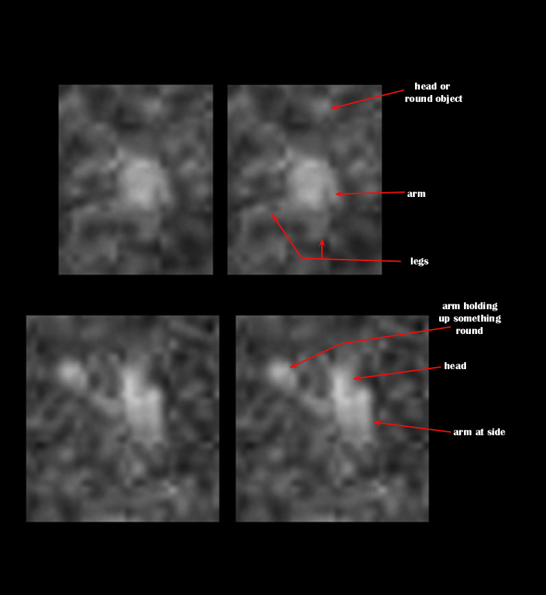 The bottom one is in relatively good condition. You can see its head, upper torso, the left arm down at its side, and it seams to be holding a round object up in the air with the right arm.It looks like a bowler.