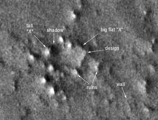 This complex contains many structures. A big X with a design in the middle. The ruins below the X are another area of interest.