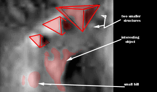 The largest one looks threesided. The other two have highly refective sides. Typical of martian structures.