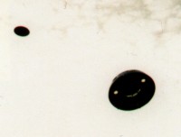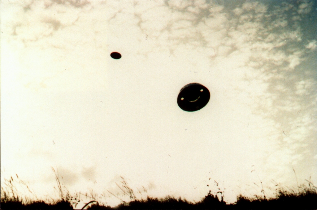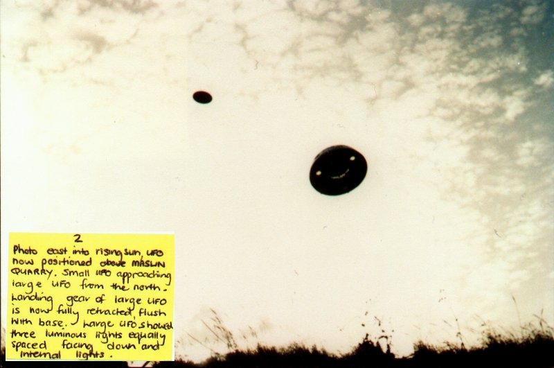 "2. Photo east into rising sun, UFO now positioned above Maslin Quarry. Small UFO approaching large UFO from the north. Landing gear of large UFO is now fully retracted, flush with base. Large UFO showed three luminous lights equally spaced facing down and internal lights." |