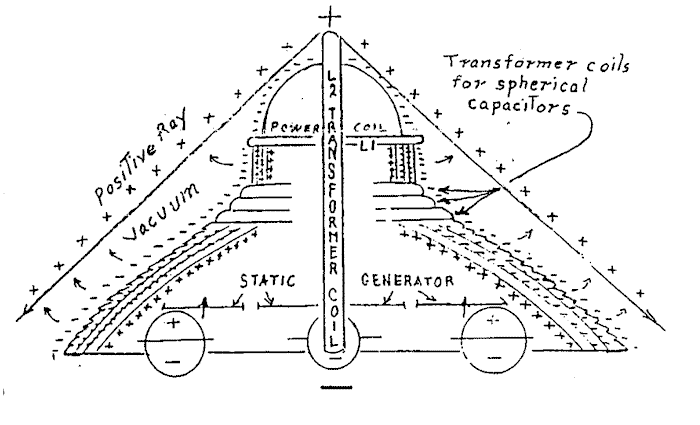 There is a staff through the center of the vehicle which serves as a superstructure for the rest of the vehicle and also caries a high voltage, high frequency coil about its self, sort of a resonant transformer which gives the electrostatic and electromagnetic charge to the craft and establishing polarity to it. This coil is relative to what is known as a Tesla coil.