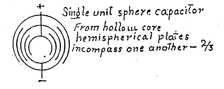 The size of these three spherical capacitors, as observed in the early years, is about four feet 10 inches in diameter. They consist of hollow core surrounded by bowl like conductive plate hemispherically overlapping one another two thirds (see illustration) with insulation between the plates. A sandwich type of capacitor with opposing plates.