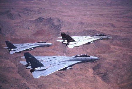 3 F-14D TomCats flying in close formation. |