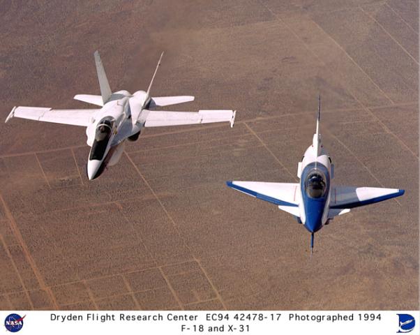 The first simulated dogfight with the x-31. This matchup is with the F/A-18 Hornet. This day, the F18 would fly away the looser. The new X31 mopped the floor with the Navy fighter. |