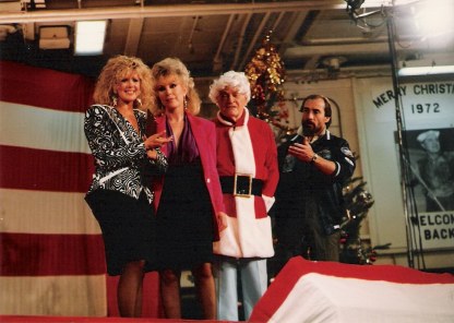 ![]() Connie West, Barbara Eden, Bob Hope, and Lee Greenwood on the hangar deck of the USS Midway during Bob's 1987 Christmas special. We were about a day and a half off the northeastern curve of Africa at the time.