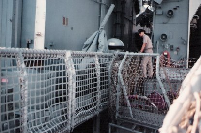 There are TWO SHIPS in the picture. I was standing on the flight deck of the USS Mobile Bay when I took this shot. I don't recall the name of the ship on the left. We were moored to the pier in the Persian Gulf, I forget whether it was in Oman or the United Arab Emirates. It is common practice to moor ships alongside one another with gangplanks connecting them. In this case, the boatswain's mates *forgot* to throw out the "bumpers" that keep the ships apart before putting tension to the lines. It's not often one hears the collision alarm go off on a ship, much less on a ship in port.