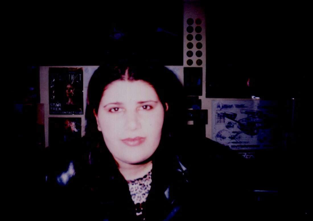 Me with nomakup, and hugging the bear I sleep with evey night, sitting onmy star trek sheets:) June 1998