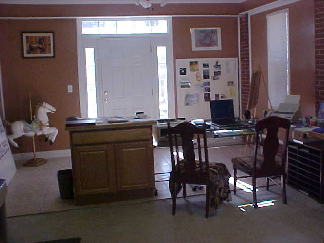 Hubby made our carport into my computer shop. He said he wanted me out of the house with my mess! ha! Sounds good to me. You can notice that there is two chairs below in the photo well one is for me and one is for boomer my dog. He sits right there on his blanket that Vivian (a good friend) made him.