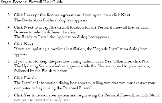 Sygate - Another free firewall. Also click on the word Sygate to the left and this takes you to their website and download it. Once on their website look over to the right of the page you will see a small computer icon with the date: 1-15-04 next to it. Well below that click on Personal Firewall Day. Again over to the right of the page in the 2nd square box that says "Need A Free Solution?" Click on get it now. Click on the small green box that says download now. This takes you to another page and click download now, then open and follow instructions. When you click open and it downloads and starts installing then that is the 1. below.