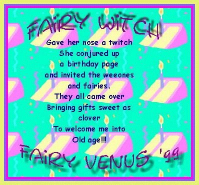 Than this month (July 99).. Fairy Venus had a birthday, and I made her a 'birthday' page. It was alot of fun, and I had a GREAT time! But the silly 'fae' sent ME a present;