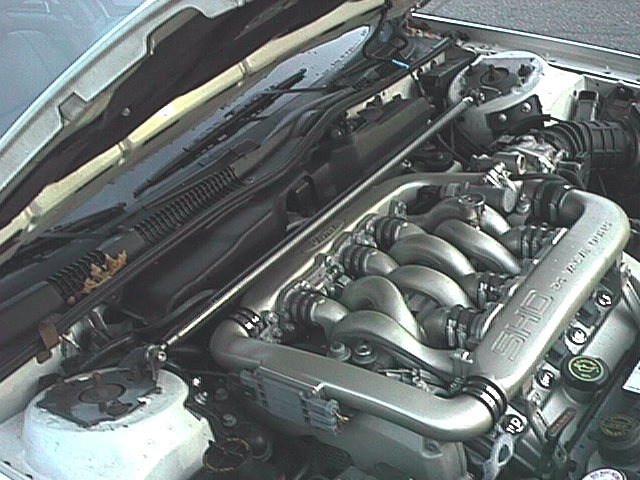 I have installed the SHO Shop's front strut tower brace. This brace it attached to the top of the strut tower and and gives the front end increased rigidity.