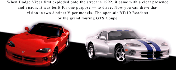 Letztes Update: 28.11.1998Willkommen auf meiner Dodge Viper Homepage. Meine Interessen: Weltweite Kommunikation von Dodge Viper Freunden!!! Chat: http://www.fortunecity.com/silverstone/allegro/111/chat.htm!!! Some Facts: RT/10: 7990cm3 V-10 90° Motor, 6-Gang Getriebe, 20 Ventile, Ventiltrieb: OHV, PS: 384 bei 5200 U/min, Drehmoment: 610nm, Max. Geschwindigkeit: 258 km/h, Maximale Drehzahl 6800 U/min, Doppelairbag, Benzinverbrauch: Stadt: 33,1 Liter/100 km, Ausserst䤴isch: 26,3 Liter /100 km...GTS: Alles gleich ausser: PS: 450 bei 5200 U/min, Max. Geschwindigkeit: 299 km/h!!!Ist das alles noch zu ������treffen???? Und zum Schluss noch dies: Gegr������ seien ADI, der den Dodge noch nie sah [b������������䤬 ups, sorry] und Peter, der *)祢 "%碥%窥 *祪 !!! (Sorry f������ie Zensur!!), ...
