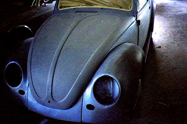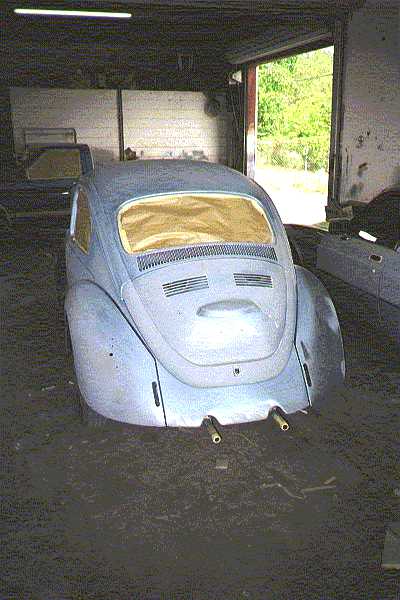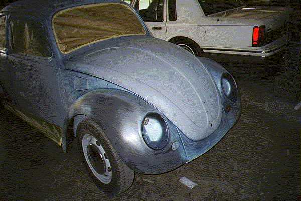 the clutch/throw-out/etc is replacedand the gutted "Motion" is in process at the body shop..... The fenders are new, and you can see that they have begun to test spray the new color Light Blue Metallic. |
